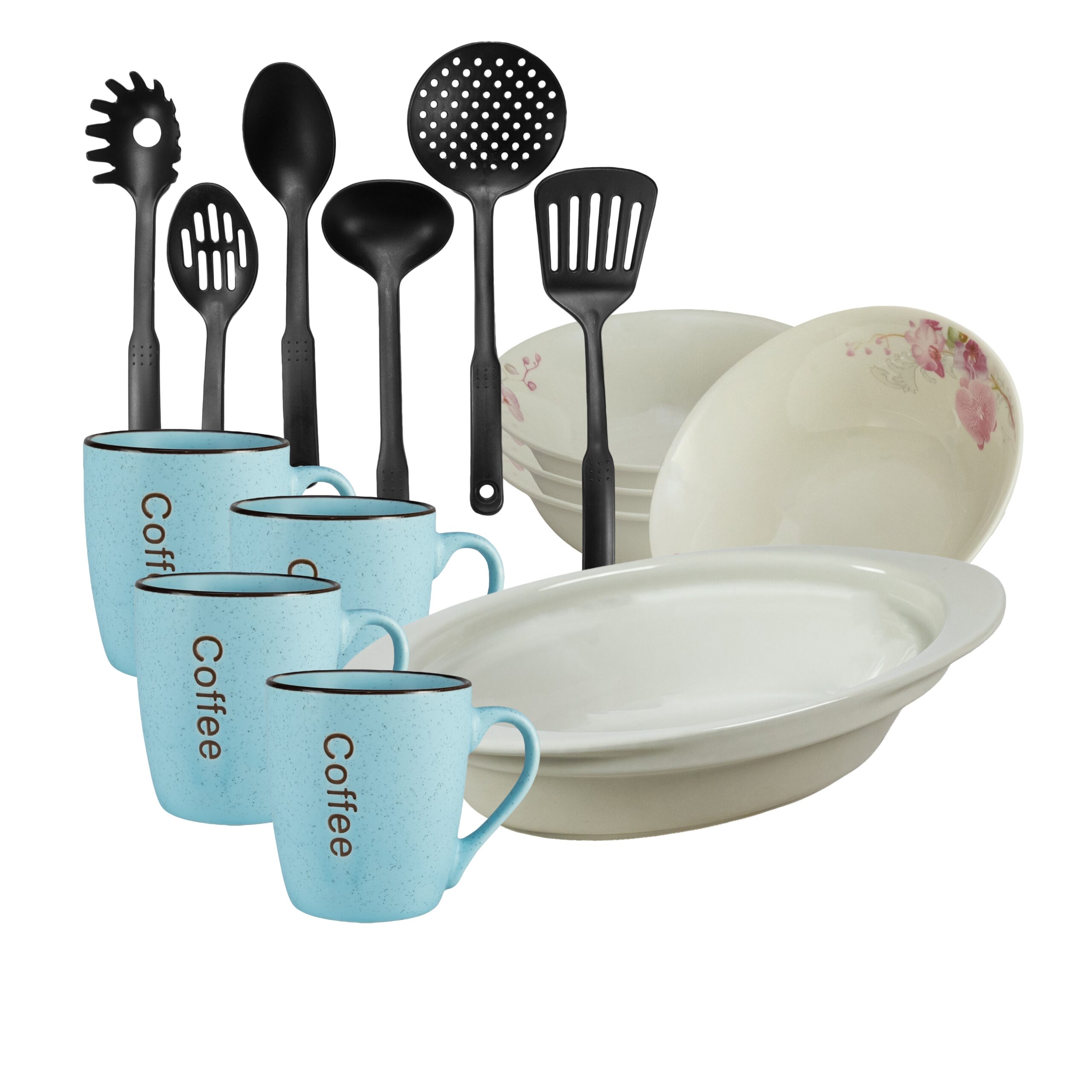 Fiecare piesă din acest set este proiectată pentru a fi practică și funcțională. Cana albastră are o capacitate generoasă pentru a vă bucura de cea mai delicioasă cafea sau ceai, în timp ce bolul este potrivit pentru a servi supe, salate sau deserturi. Tava termorezistentă vă permite să pregătiți și să serviți mâncarea caldă fără să vă faceți griji că va fi afectată de temperaturi înalte. Ustensilele de bucătărie incluse completează setul și vă ajută să pregătiți și să serviți cu ușurință diferite preparate.